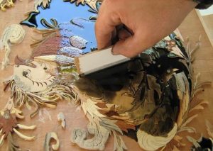 ۵ – در خاتمه یک قشر نازک دیگر از کیلر بر سطح کار می پاشند. اشکالی که در اغلب تابلوهای معرق روی چوب پیش می آید، انحناء و خمیدگی آنهاست. به این معنی که چوب و رنگ یا لاک به یک اندازه قابلیت جذب رطوبت را ندارد و پس از چندی، سطح تابلو تاب بر می دارد. روی تابلو که رنگ یا لاک قرار دارد، کمتر از قسمت پشت آن که هیچ گونه پوششی ندارد، رطوبت را جذب می کند و در نتیجه منجر به انبساطی نابرابر در دو طرف می شود. برای جلوگیری از این مشکل می توان پشت تابلو را با ماده ای مثل موم یا صمغ یا یک قشر نازک از لاکی که در روی تابلو قرار گرفته، پوشاند و بدین ترتیب مانع جذب آب شد.