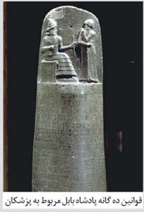 در حدود سال ۱۷۰۰ قبل از میلاد، حمورابی، پادشاه قدرتمند بابل، (منطقهای که اکنون بخشی از عراق است) دستور داد تا قوانین حکومتیاش را بر ستونی سنگی حک کنند: در کتاب طب: تاریخچهای مصوّر، نوشتهی آلبرت اِس لیونز و اَر. جوزف پتروچلی بعضی از قوانین دهگانهی مربوط به پزشکان آمده است:
