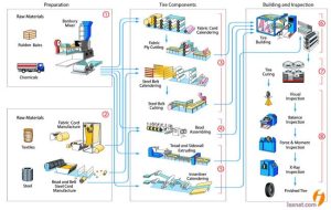 هرچند که تولید تایر بر اساس نوع و طبقهبندی آن ( تایرهای باری سبک و سنگین) و هم چنین نوع فناوری مورد استفاده ( بایاس و رادیال ) ، در مراحلی از تولید با هم تفاوتهائی دارند ، اما به صورت کلی میتوان تولید آنرا در چهار مرحله خلاصه کرد که جریان تولید را در شکل بالا مشاهده می نمایید.