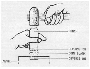 در ایران معمولاً سکه را با چکش ضرب میزدند و طریقه ضرب این گونه مسکوکات آسان بود. قرنها به این ترتیب عمل میکردند که ابتدا نقش پشت سکه را روی فلز محکمی که معمولاً از فولاد بود به طور معکوس و منفی حکاکی میکردند و آن را در وسط سندان کار میگذاشتند و به همان طرز عیناً نقش روی سکه را نیز در سر سنبهای از فولاد حکاکی میکردند. پس از تعیین عیار مناسب فلزات و ذوب و شمش نمودن، آنها را خرد کرده، به قطر و وزن لازم به صورت قطعاتی میبریدند و آن را گداخته، به ضرب فشار چکش به صورت مسکوک در میآوردند.