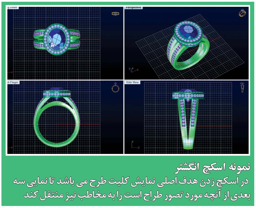 اسکچ های ترسیم شده در پرسپکتیو، تمامی ویژگی های طرح را منتقل نمی کند. ترسیم طرح از نماهای مختلف توسط طراح، به تولیدکننده و سفارش دهنده این امکان را می دهد تا ویژگی های کامل طرح را به درستی درک کند. برای این موضوع معمولا طرح های سه بعدی مانند انگشتر ها، از سه نما (پلان، جانبی، روبرو) ترسیم میشوند. ترسیم طرح از سه نما مانند ترسیم یک نقشه مهندسی ابعاد و اندازه ها زوایای پنهان و ساختار طرح را به طور کامل مشخص می کند. فرآیند قالبسازی چه به صورت دستی و چه با استفاده از کامپیوتر صورت گیرد، مستقیما برای ساخت مدل از این نقشه ها استفاده می شود.