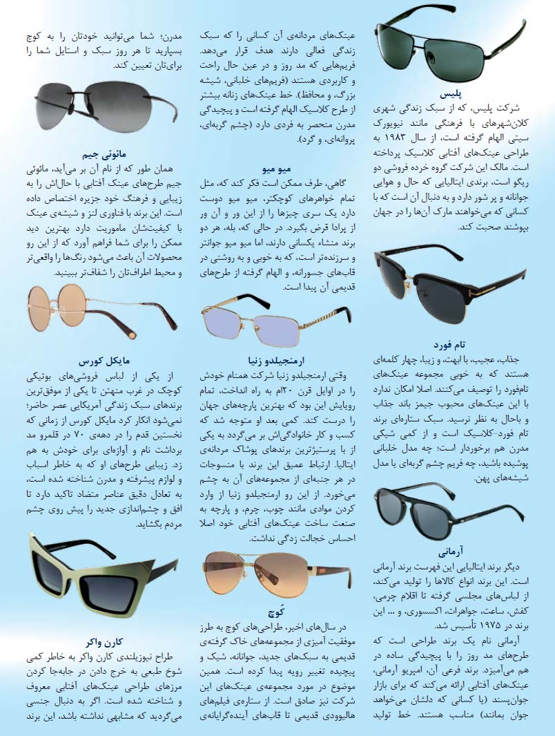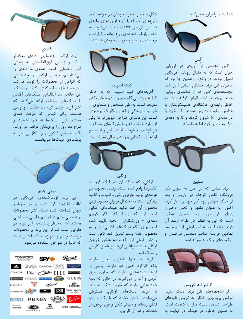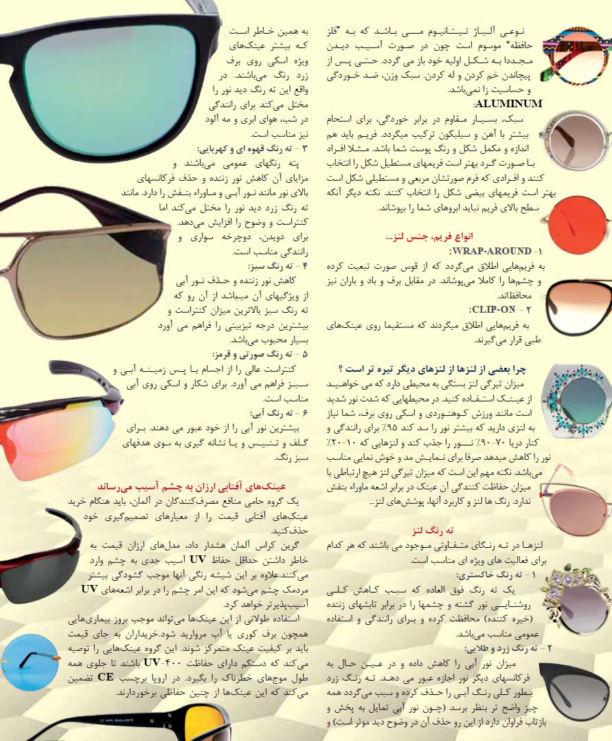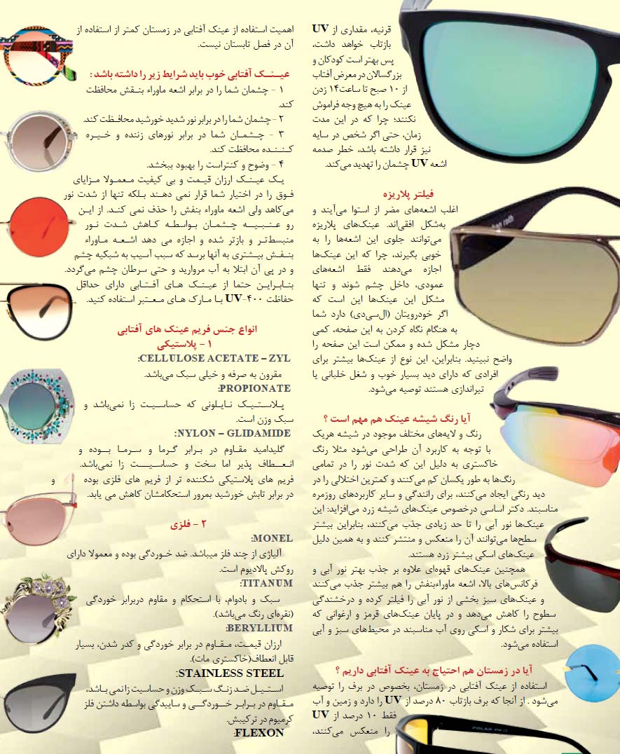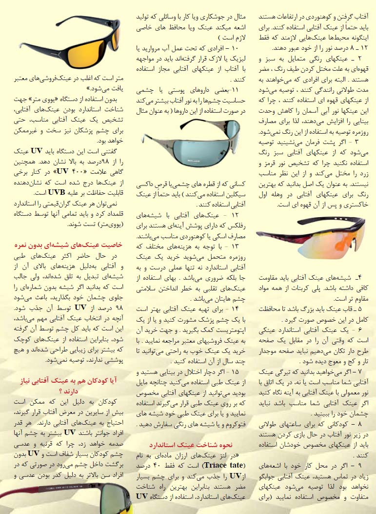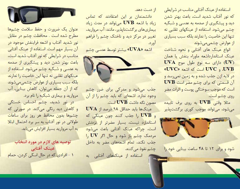 استفاده از عینك آفتابی مناسب در شرایطی كه نور آفتاب شدید است، باعث بهتر شدن دید و پیشگیری از صدمه به عدسی و شبكیه چشم میشود. استفاده از عینكهای تقلبی نه تنها این خاصیت را ندارند بلكه سبب بسیاری از عوارض چشمیمیشوند.