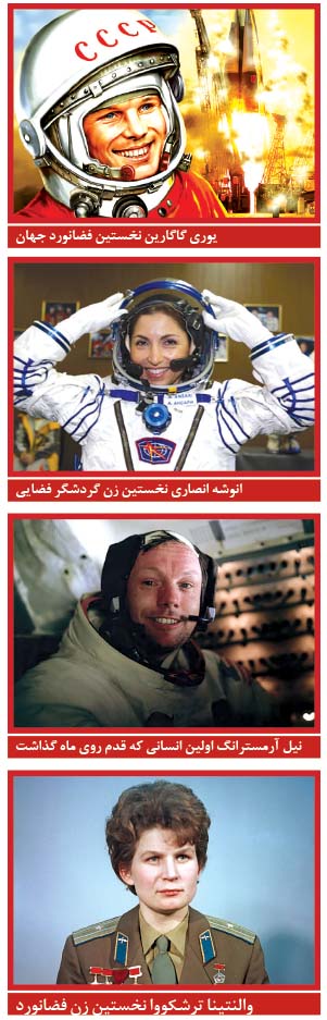 نخستین فضانورد جهان یوری گاگارین کیهاننورد روسی بود که روز ۲۳ فروردین ۱۳۴۰ با فضاپیمای وستوک-۱ به فضا رفت و در طول ۱۰۸ دقیقه یک دور مدار زمین را پیمود.