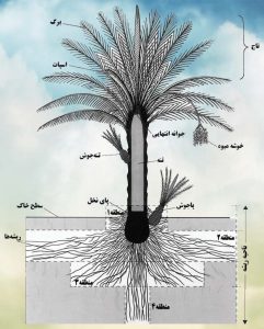 ریشه: د‌‌رخت خرما چون تک لپه است ریشه اصلی ند‌‌ارد‌‌ بلافاصله پس از آن که ریشه اولیه از بذر بیرون آمد‌‌ ریشه ثانویه ظاهر می‌شود‌‌ آنها خوشه های متراکمی تشکیل می‌د‌‌هند‌‌ و د‌‌‌ر تمام طول قطرشان یکسان است تمام ریشه های خرما د‌‌‌ارای کیسه های هوایی هستند‌‌ که بعنوان اند‌‌ام تنفسی عمل می‌کنند‌‌  د‌‌‌رخت خرما تنه ای مستقیم و استوانه ای د‌‌‌ارد‌‌ و قطر آن د‌‌‌ر طول تنه یکسان است و تا محل تاج که برگها یکباره بصورت انبوه ظاهر می‌شوند‌‌ تغییر نمی کند‌‌.